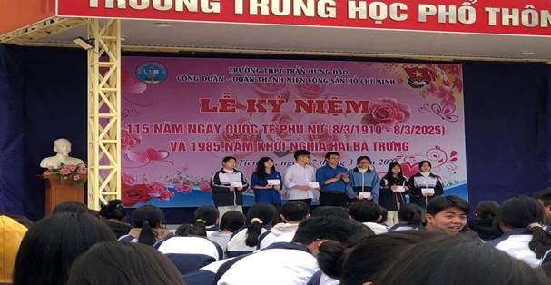 Hòa chung không khí kỷ niệm 115 năm Ngày Quốc tế Phụ nữ (8/3/1910 – 8/3/2025) và 1985 năm Ngày Khởi nghĩa Hai Bà Trưng, chiều ngày 07/3/2025, Công đoàn trường THPT Trần Hưng Đạo phối hợp với Đoàn TNCS Hồ Chí Minh đã long trọng tổ chức Lễ mít tinh với sự tham gia của các đại biểu Tỉnh đoàn Hưng Yên, Huyện đoàn Tiên Lữ cùng các thầy giáo, cô giáo, cán bộ, nhân viên nhà trường và toàn thể các em học sinh trong toàn trường.