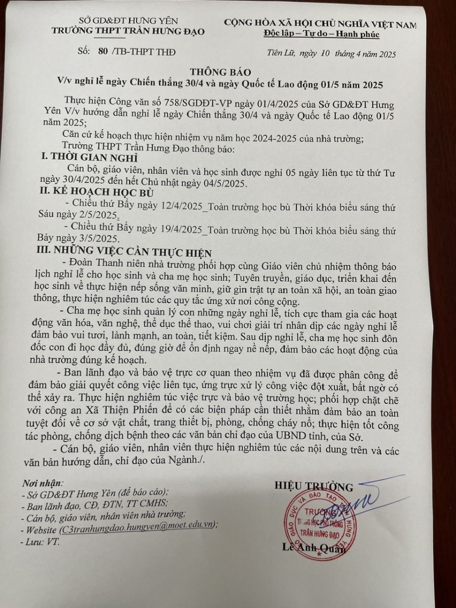 Thông báo V/v Nghỉ lễ ngày Chiến thắng 30/4 và ngày Quốc tế Lao động 01/5 năm 2025(24/04/2025)