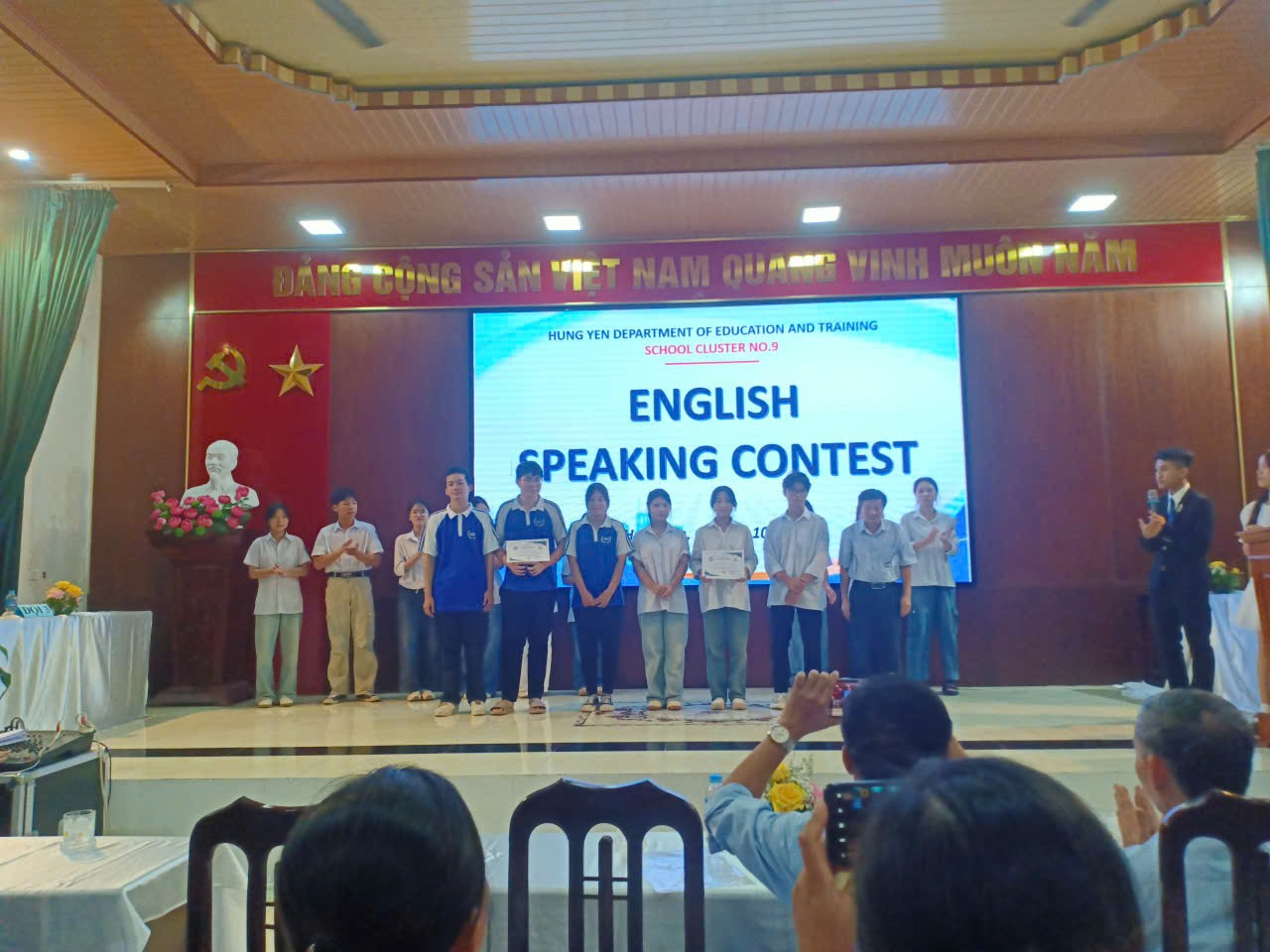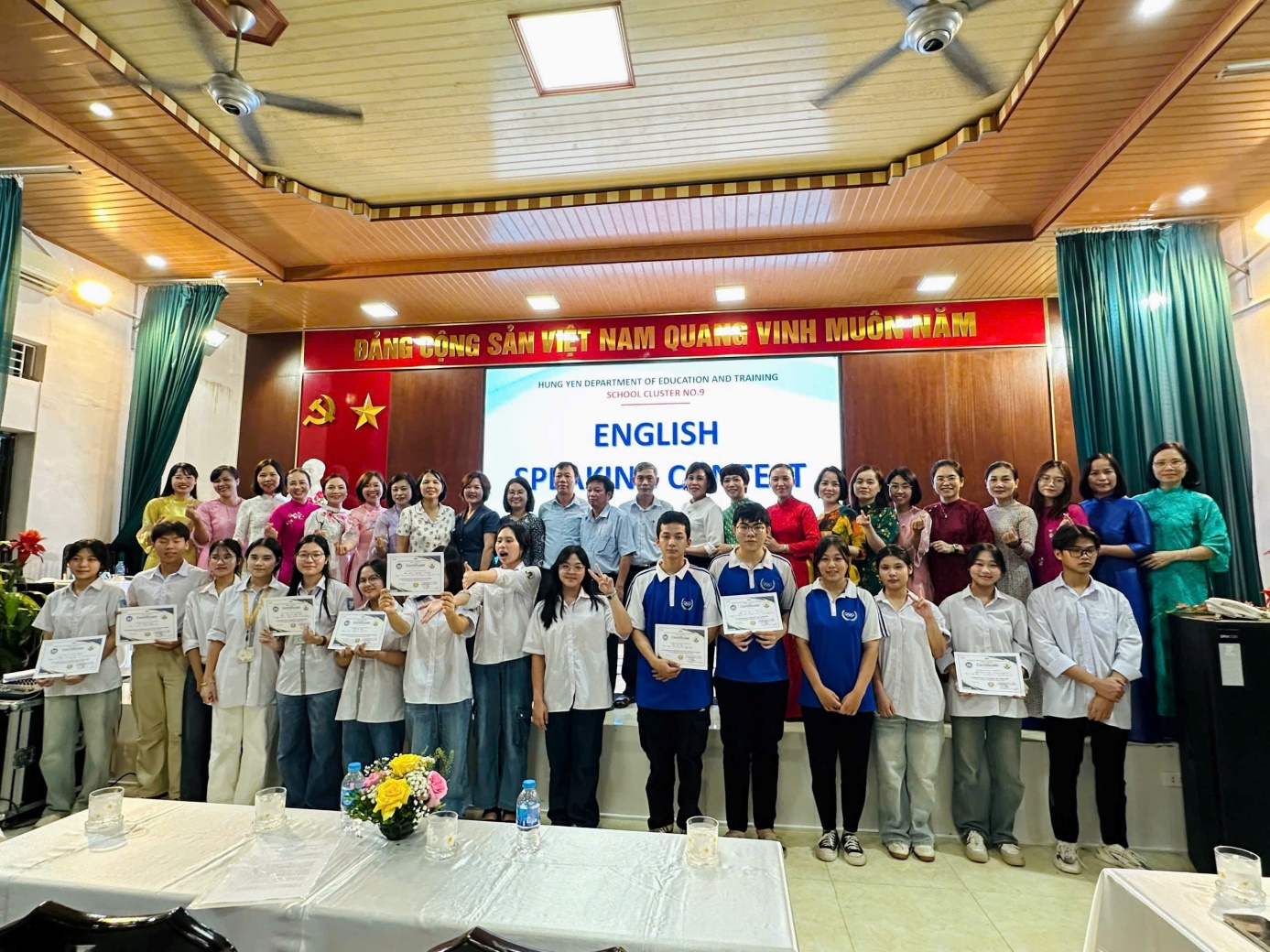 Cuộc thi Hùng biện Tiếng Anh của Cụm chuyên môn số 9 đã khép lại trong niềm vui và tự hào. Dư âm của các bài Hùng biện sôi nổi, những nụ cười tự tin và ánh mắt rạng rỡ của các thí sinh vẫn còn đọng lại. Mỗi em học sinh dù đạt giải hay không , đều đã là người chiến thắng – chiến thắng chính mình, vượt qua nỗi sợ hãi để cất lên tiếng nói của tuổi trẻ. Hy vọng rằng, ngọn lửa đam mê học tập Tiếng Anh sẽ tiếp tục được thắp sáng và lan tỏa trong mái mỗi trường THPT