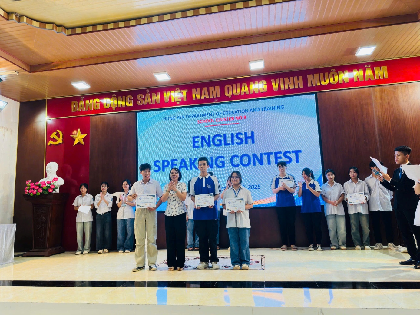 Thực hiện kế hoạch của Sở Giáo dục và Đào tạo Hưng Yên về nâng cao chất lượng dạy và học ngoại ngữ trong các cơ sở giáo dục. Ngày 10 tháng 10 năm 2025 cuộc thi Hùng biện Tiếng Anh vòng cơ sở của Cụm chuyên môn số 9 đã diễn ra tại trường THPT Chuyên Hưng Yên đã thành công tốt đẹp.